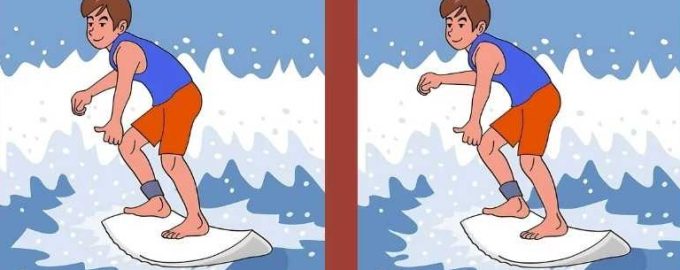 На снимката виждаме момче сърфист, което покорява вълните на дъска за сърф. На пръв поглед може да ви се стори, че момчетата на двете снимки са едни и същи, но ако се вгледате по-внимателно, ще стане ясно, че това не е така – някъде има няколко разлики, които правят снимките различни.